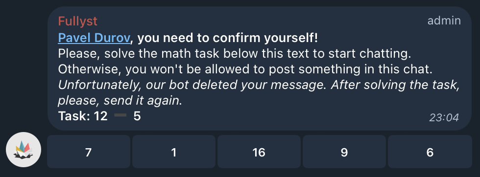 Math captcha requires some skills: you need to be able to solve a simple math problem like "23-8, 17+2, 5+13". You will have a limited number of attempts, so be careful, because if you reach the limit, you will be banned from the chat and only chat's administrators can unban you.