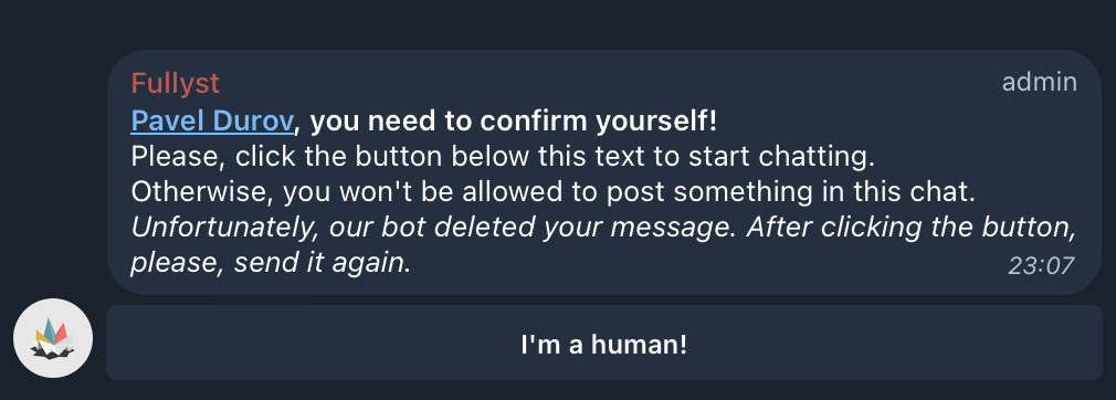 > Unfortunately, along with the growth of the Telegram Messenger, more and more spam bots appear, so chats administrators who want to keep chats clean from spam turned on the "captcha" function.